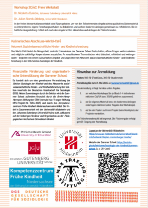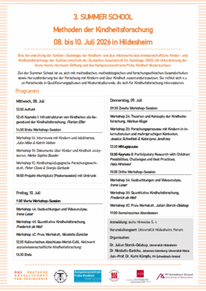 Vom 08.-10. Juli 2026 findet auch in diesem Jahr die Summer School Methoden der Kindheitsforschung statt. In diesem Jahr sind wir nicht in Schwäbisch Gmünd, sondern an der Universität Hildesheim. Wie in den Vorjahren auch, wird es neben zwei Keynotes (Prof. Dr. Florian Eßer, Dr. Hala Mreiwed) sechs verschiedene Workshop-Angebote sowie drei freie Werkstätten geben, in denen eigenes Material eingebracht werden kann. Außerdem bietet das Netzwerk Sozialwissenschaftliche Kinder- und Kindheitsforschung dieses Mal einen eigenen Zeitslot für Posterpräsentationen zu eigenen Projekten der Teilnehmenden an. Darüber hinaus wollen wir bei einem abschließenden World-Café mit Ihnen und euch allen in den Austausch über gemeinsame Themen, Fragen, mögliche Projekte und vieles mehr kommen.