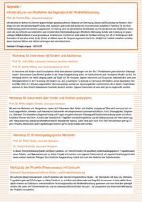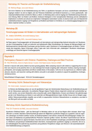 Die Teilnehmenden konnten aus sechs Workshops und zwei Forschungswerkstätten wählen, von denen jeweils zwei Angebote parallel stattfanden. Dazu gehörten: Gruppendiskussionen mit Kindern (Karin Kämpfe & Carolin Gravel, Universität zu Köln); Ethische Fragen im Forschen mit Kindern (Stephanie Meiland, Universität Hildesheim); Mobile Methoden der qualitativen Kindheitsforschung (Tabea Freutel-Funke, Eberhart Karls Universität Tübingen & Dr. Julian Storck-Odabaşı); Differenz und Adressierung – Kinder als Akteur*innen von Forschung (Dr. Stephanie Simon, TU Dortmund); Situationsanalyse (Dr. Jana Mikats, Webster University & Dr. Nicoletta Eunicke); Biographie und Narration in der Kindheitsforschung (Dr. Susanne Siebholz, TU Chemnitz) sowie zwei freie Werkstätten unter Leitung von Karin Kämpfe und Julian Storck-Odabaşı.